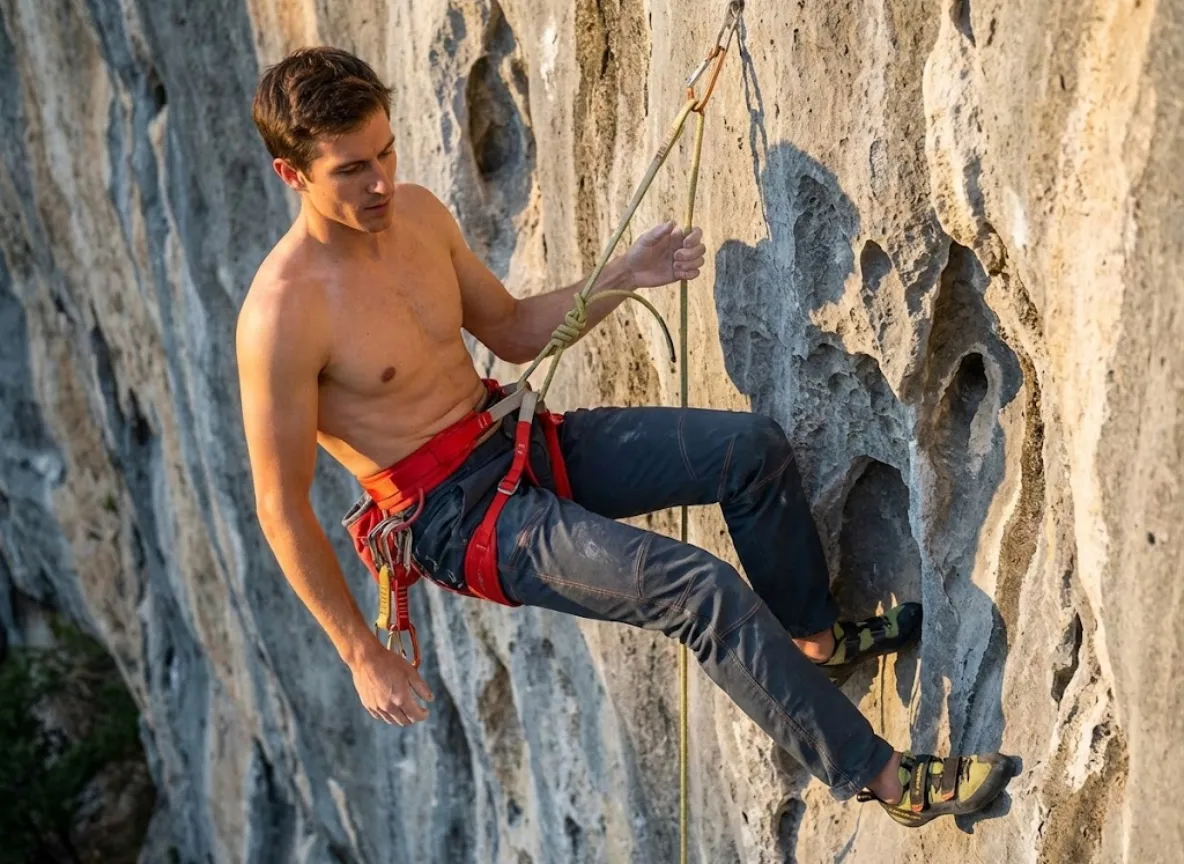 Side profile of a climber with muscular thighs wearing a properly fitted Edelrid harness, demonstrating the correct leg-to-waist ratio fit.