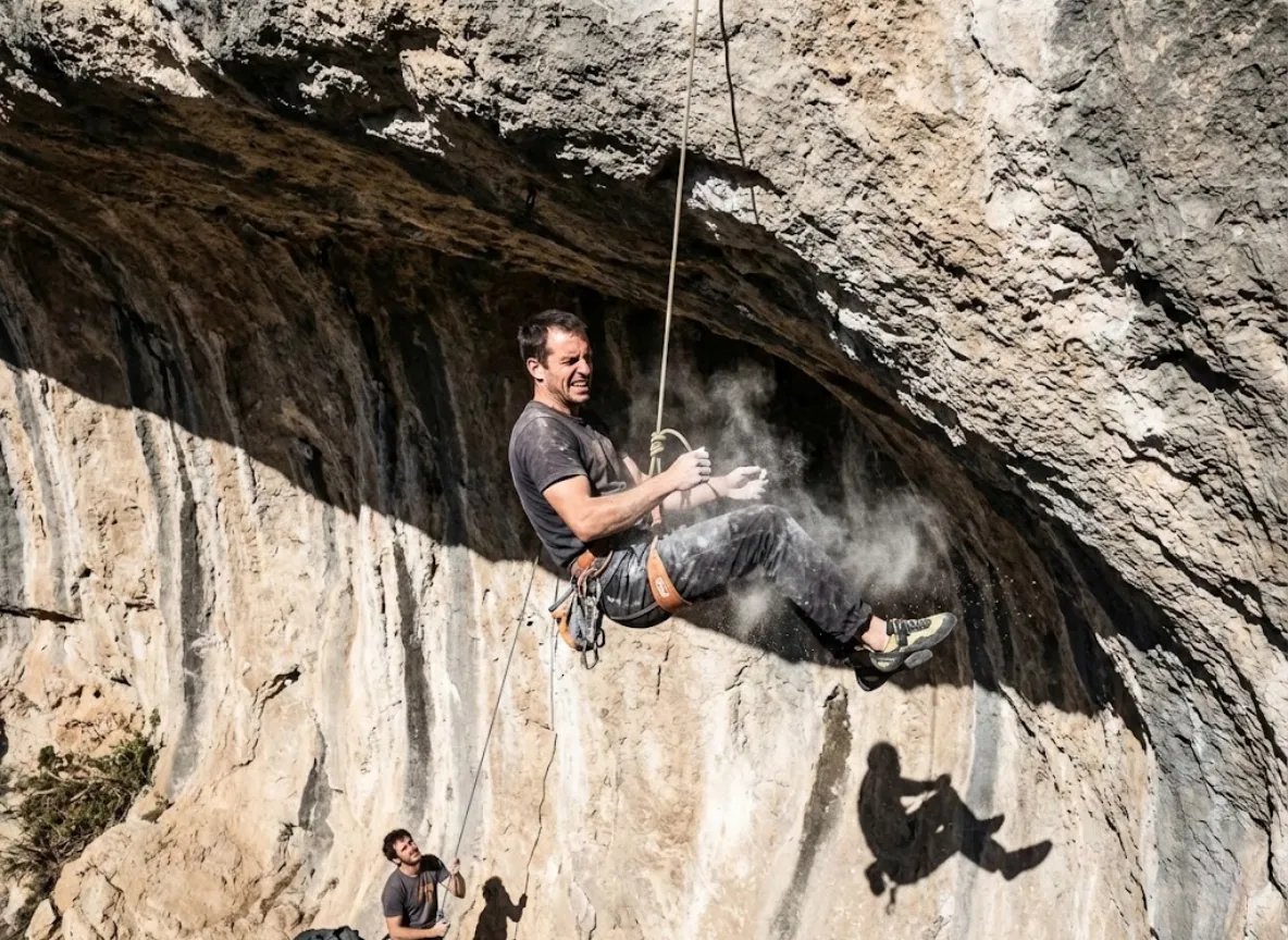 A rock climber falling on a sport route, suspended by a Petzl climbing harness against a limestone wall.